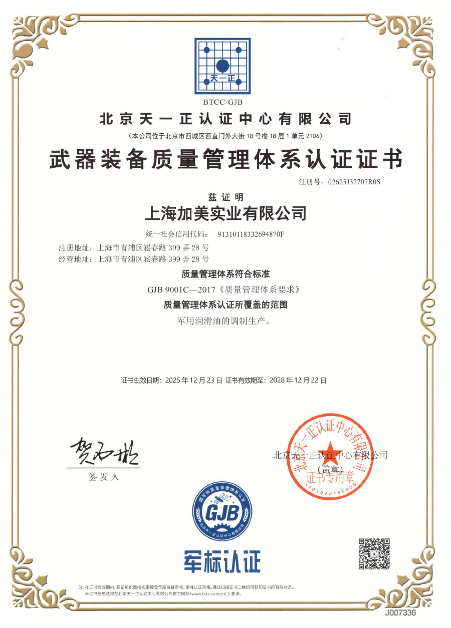 近日,上海加美实业有限公司(以下简称“上海加美”)成功通过GJB9001C-2017武器装备质量管理体系认证,并荣获权威认证证书。这标志着上海加美在润滑油及精细化工产品的设计、开发、生产和服务领域的质量管理体系,已完全满足国家军用标准,具备了为国防科技工业提供高标准、高可靠性产品与服务的资格与能力。此举不仅是公司发展史上的一个重要里程碑,更是其长期坚持“质量就是生命”理念的权威印证。